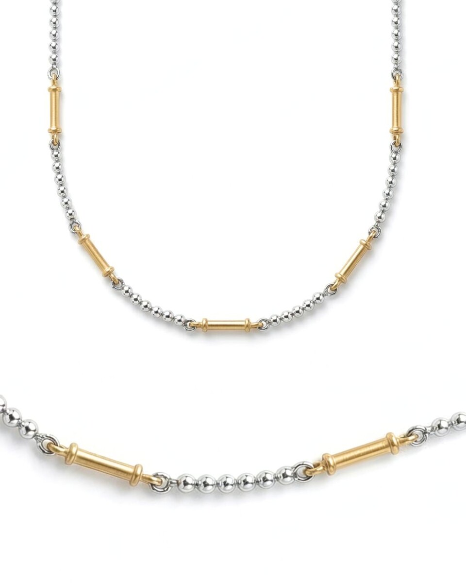 Delikatny naszyjnik z kolekcji Grass opowiada o drodze rozwoju – o tym, co dzieje się pomiędzy punktami przełomu. Inspirowany strukturą źdźbła trawy, łączy regularność z subtelnymi kontrastami: srebrny łańcuszek o kulkowej fakturze przeplata się ze złoconymi segmentami przypominającymi naturalne węzły wzrostu.