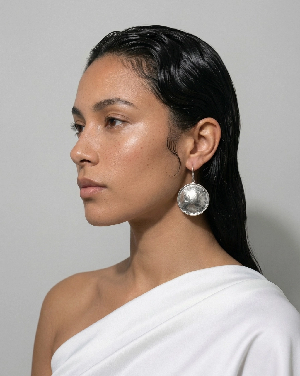 Te kolczyki budują wizerunek w sposób spokojny, ale wyraźny. Okrągła forma naturalnie współgra z linią twarzy, a nieregularna struktura przełamuje przewidywalność klasycznych, gładkich modeli. Dzięki temu wyglądają nowocześnie, mimo że bazują na jednym z najbardziej ponadczasowych kształtów.