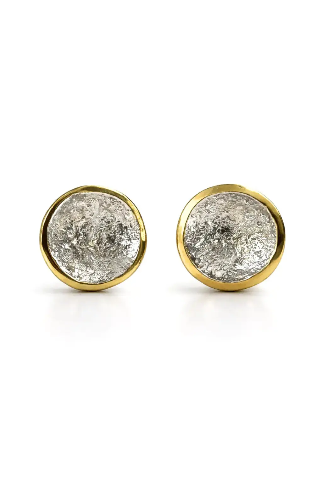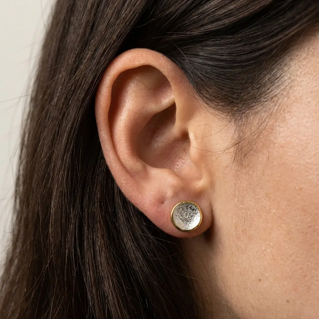 Centralna część kolczyka ma surową, nieregularną fakturę, która zachowuje ślady procesu. Światło rozprasza się na mikrowgłębieniach i delikatnych wypukłościach, dzięki czemu każdy ruch głowy zmienia odbiór powierzchni. Złocona obwódka porządkuje kompozycję i subtelnie podkreśla okrąg – jak horyzont odcinający tarczę księżyca od nocnego nieba.