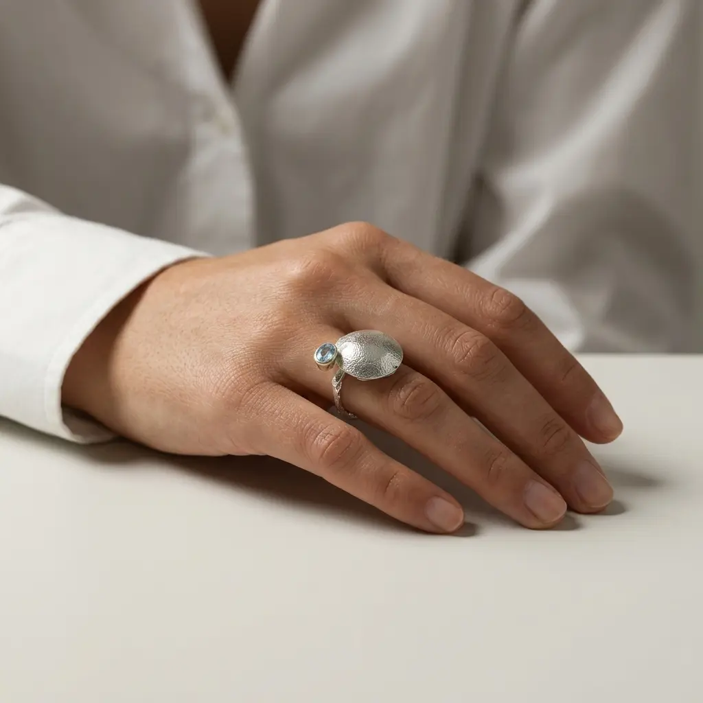 Autorskie rzemiosło: Każdy egzemplarz jest ręcznie rzeźbiony w naszej polskiej pracowni. Organiczna, surowa faktura srebra sprawia, że światło pracuje na nim w niepowtarzalny sposób.