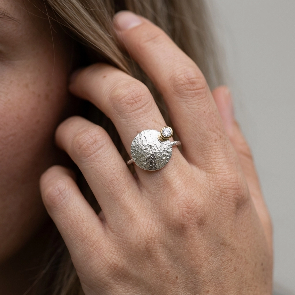 Autorskie rzemiosło: Każdy egzemplarz jest ręcznie rzeźbiony w naszej polskiej pracowni. Organiczna, surowa faktura srebra sprawia, że światło pracuje na nim w niepowtarzalny sposób.