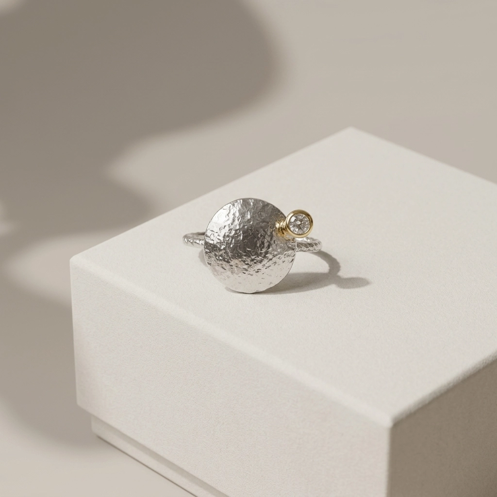 Filozofia światła: Pierścionek z kolekcji Moon to metafora relacji między kobietą a jej wizerunkiem. Tak jak księżyc staje się widoczny dzięki gwieździe, tak biżuteria nabiera znaczenia dopiero w dialogu z Twoją osobowością.