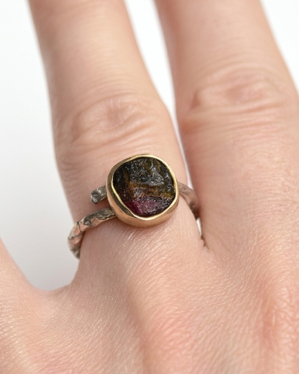 Srebrny pierścionek z ciemnym turmalinem arbuzowym to propozycja dla kobiet, które cenią biżuterię konkretną i minimalistyczną w wyrazie. Dopiero przy bliskim kontakcie i odpowiednim świetle kamień ukazuje swoją złożoną naturę i delikatne przejścia kolorystyczne charakterystyczne dla odmiany arbuzowej. Bryła minerału została osadzona w prostej, złoconej kasetce, co wydobywa szlachetność materiału i tworzy kontrast z surowo wykończoną, srebrną obrączką.