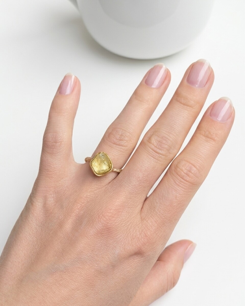 Srebrny pierścionek z surowym cytrynem stanowi połączenie siły natury z wyrafinowanym, rzemieślniczym detalem. Wykorzystanie nieoszlifowanego kamienia sprawia, że każda płaszczyzna inaczej załamuje światło, nadając biżuterii dynamiczny, niemal żywy charakter. Złocona kasetka o miękko otula krawędzie minerału, tworząc szlachetny kontrast dla fakturowanego srebra obrączki. Każdy element tej oprawy powstał ręcznie, z uwzględnieniem unikatowej formy konkretnego kamienia.
