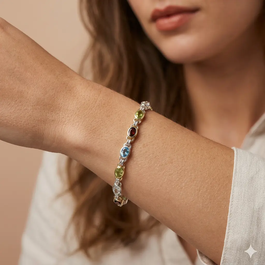 W wersji kolorowej kamienie układają się w subtelną grę światła i barw. Granat wnosi głębię, perydot świeżość, a topazy – biały i niebieski – dodają kompozycji jasności oraz przejrzystości. Całość tworzy bransoletkę, która przyciąga uwagę detalem i świetnie współpracuje z klasyczną garderobą.