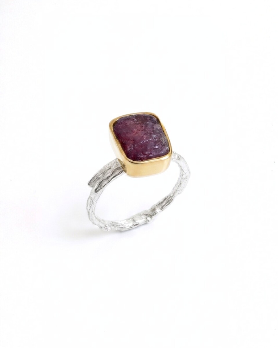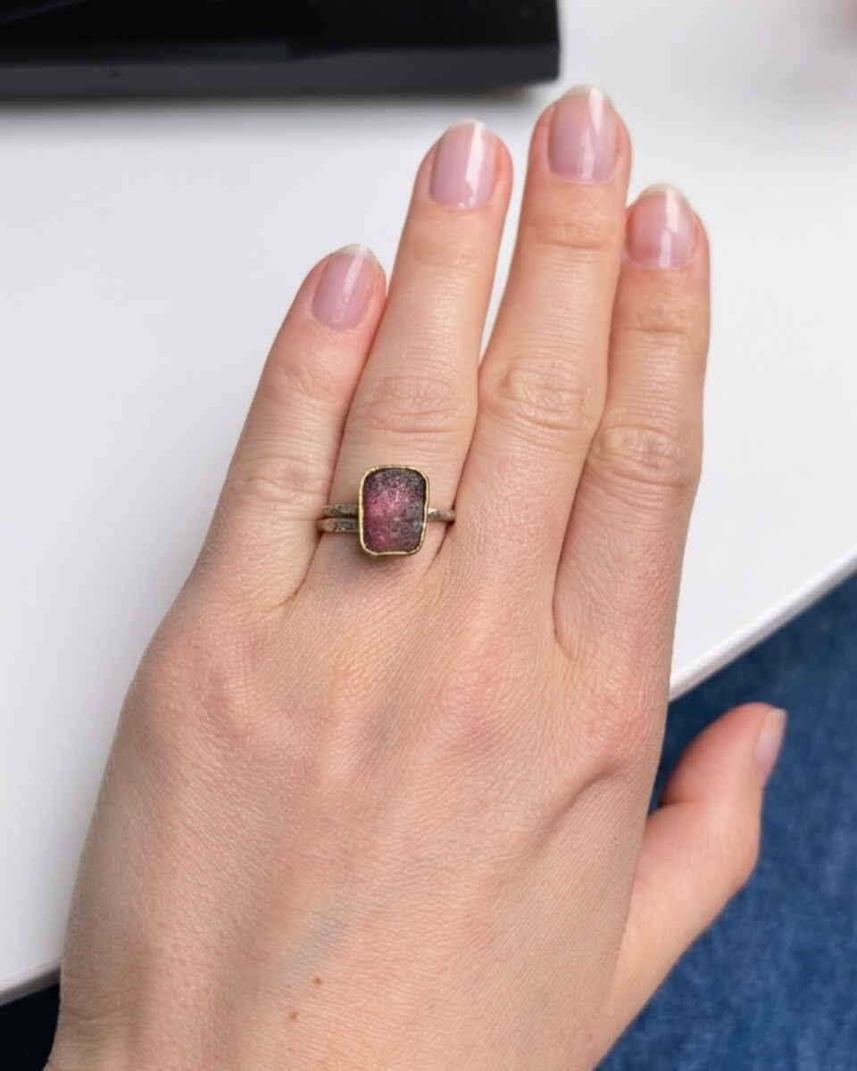 Srebrny pierścionek z różowym turmalinem to propozycja dla kobiet, które cenią wyraziste rzemiosło pozbawione zbędnych zdobień. Intensywny odcień kamienia w surowej formie został ujęty w geometryczną, złoconą kasetkę, co nadaje całości nowoczesny i zdecydowany charakter. Pracujemy na materiale niekalibrowanym, dlatego każdy element oprawy jest dopasowywany ręcznie do konkretnej bryły, co gwarantuje, że Twój egzemplarz jest jedynym w swoim rodzaju.
