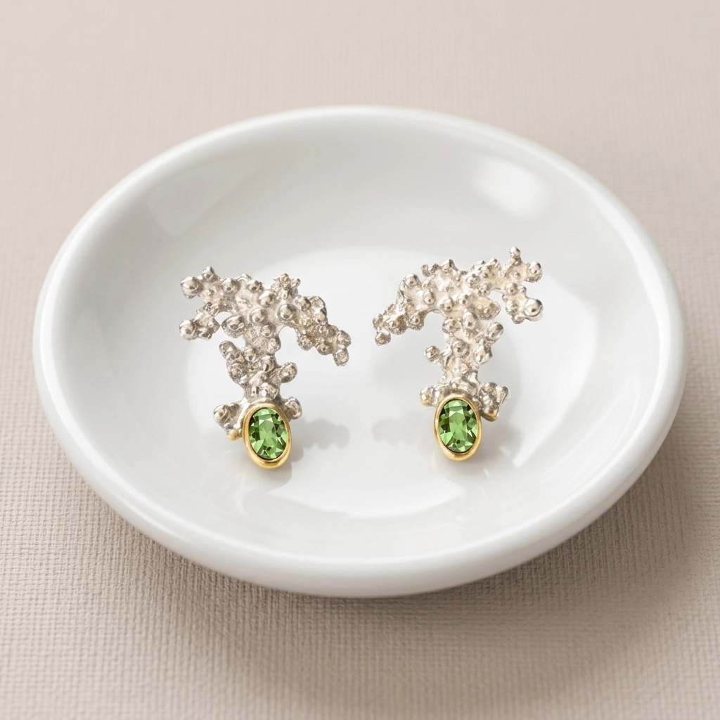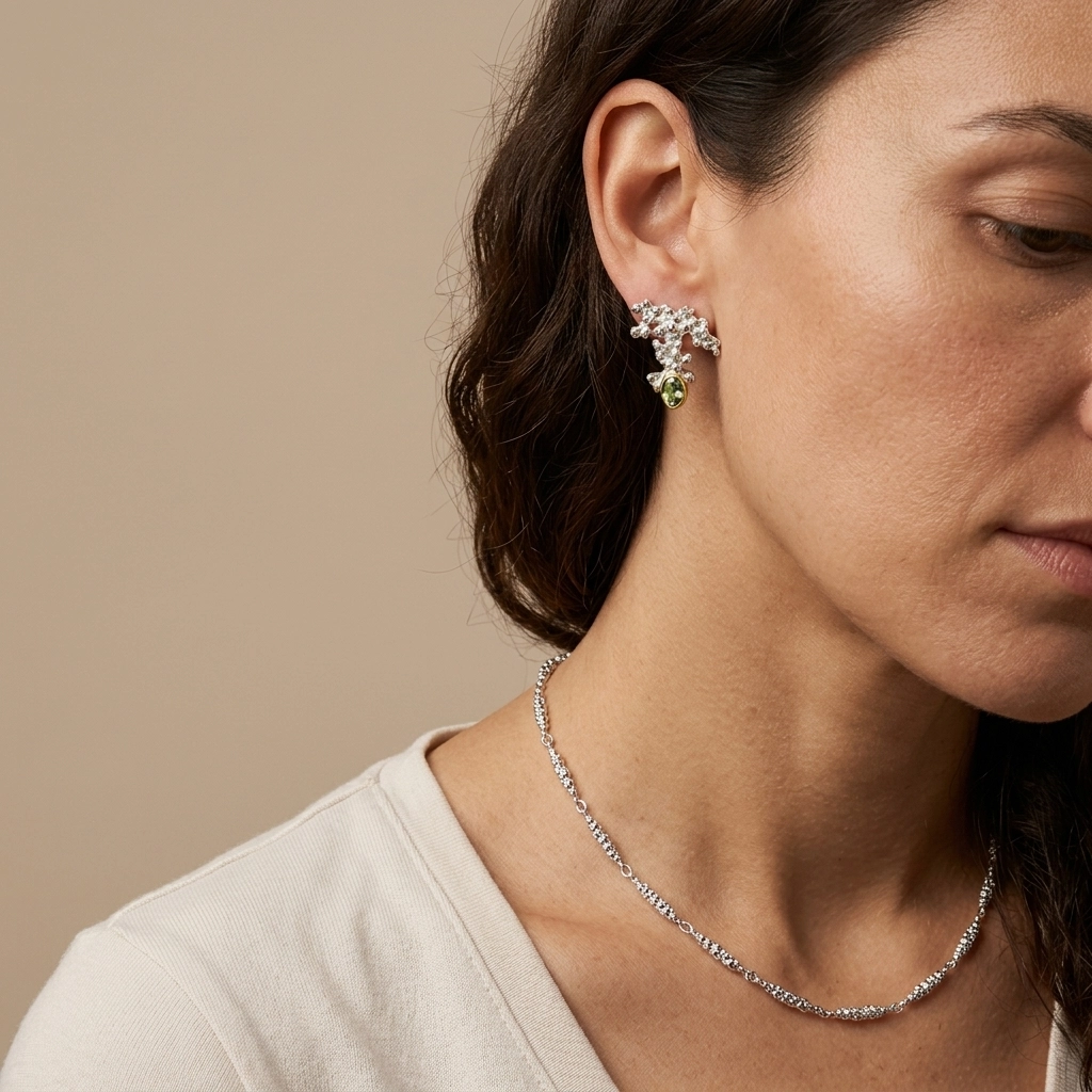 - Światło jako element projektu – nieregularna faktura sprawia, że biżuteria zmienia się w ruchu i wygląda inaczej w zależności od oświetlenia.